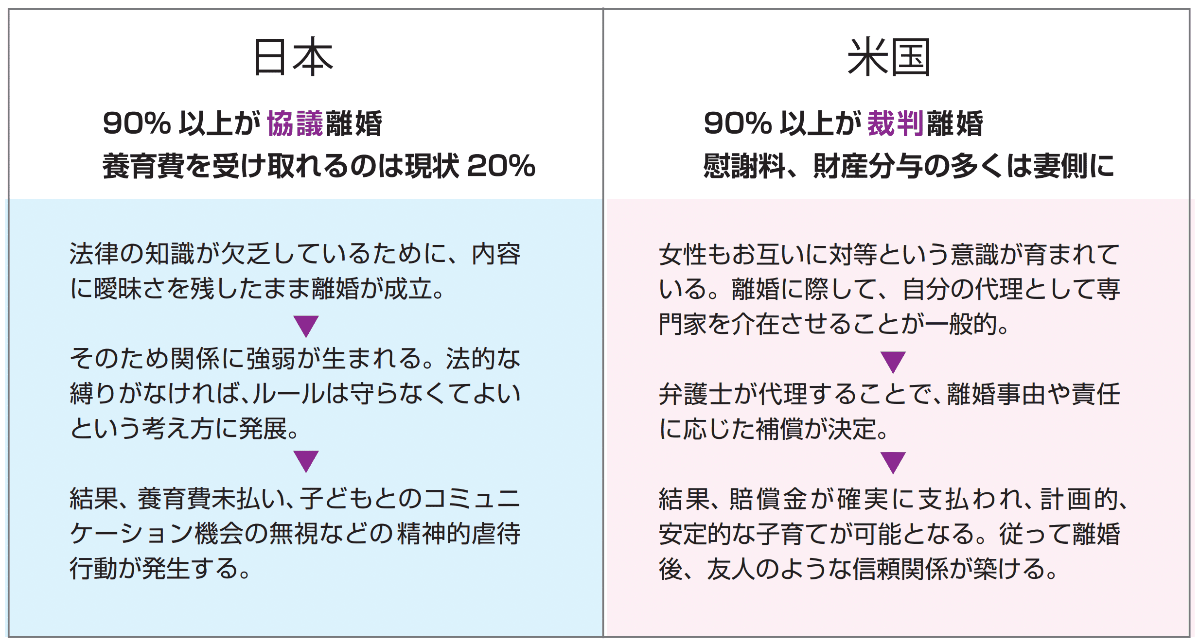 顕著なのは日米比較、ほとんどが夫婦同士の話し合いで終わる日本に比べ、米国では圧倒的に裁判離婚が選択されています。専門家である弁護士を入れて詳細をあらゆる方面で存分に検討し、決定を守らない場合の罰則を含めた書面で裁判所で正式に決定。そのプロセスを踏むことでルールが明快になり、年月を経ても守られます。結果、トラウマや後悔などがファミリーに残ることを防ぎ、お互いの家族との自由な行き来も可能になっています。
