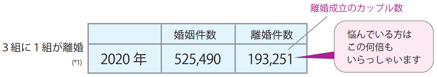 厚生労働省の統計では2020年の離婚は約19万組(*1)、これを人数に換算すると38万人です。