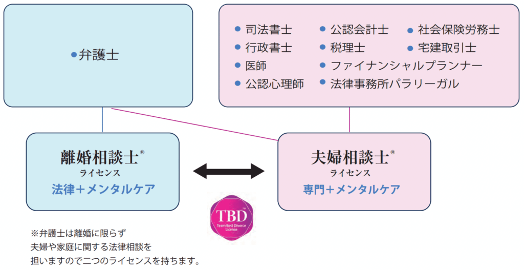 《チーム・ベスト・ディボース》は、夫婦・家族の問題で関わるさまざまな分野のスペシャリストで構成されます。そのなかで、法律に関することは「離婚相談士」/「夫婦相談士」である弁護士のみが担います。法律以外は、それぞれの専門とカウンセリングを「夫婦相談士」が担います。